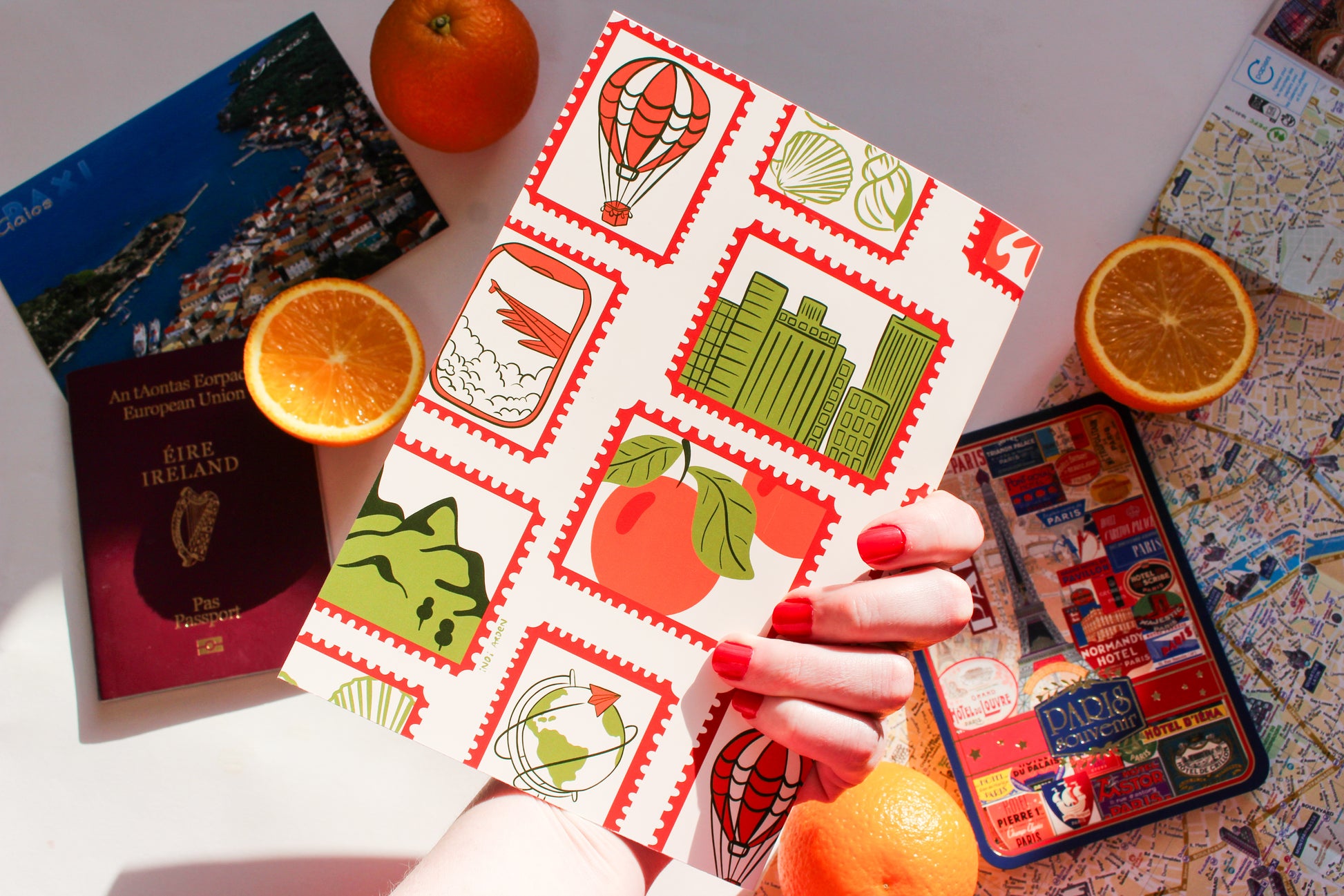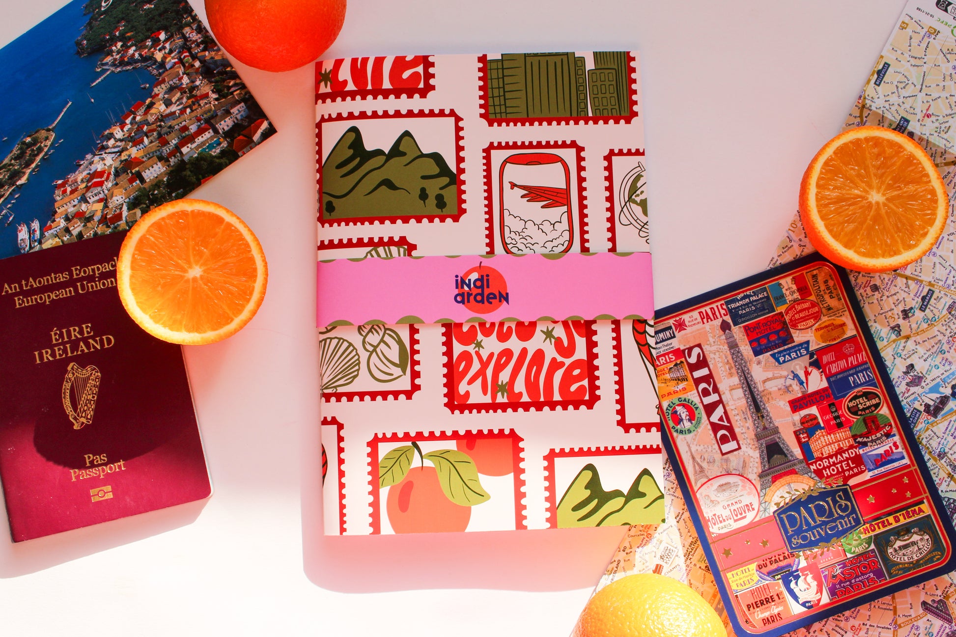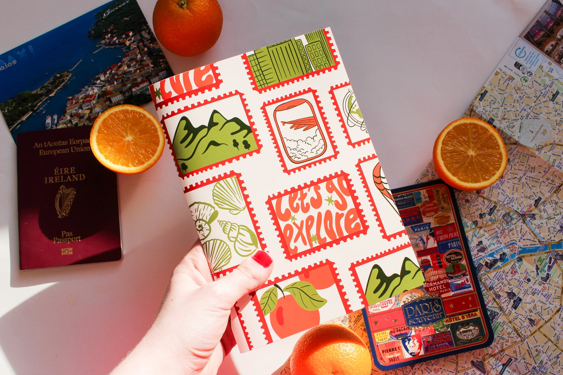 Part of the Wandering Pages Collection, this notebook is inspired by vintage travel stamps, well-loved maps, and the feeling of filling journal pages while exploring somewhere new. With warm colours and travel-inspired illustrations, it’s designed to capture the excitement of planning trips, reflecting on journeys, and collecting memories from places near and far.