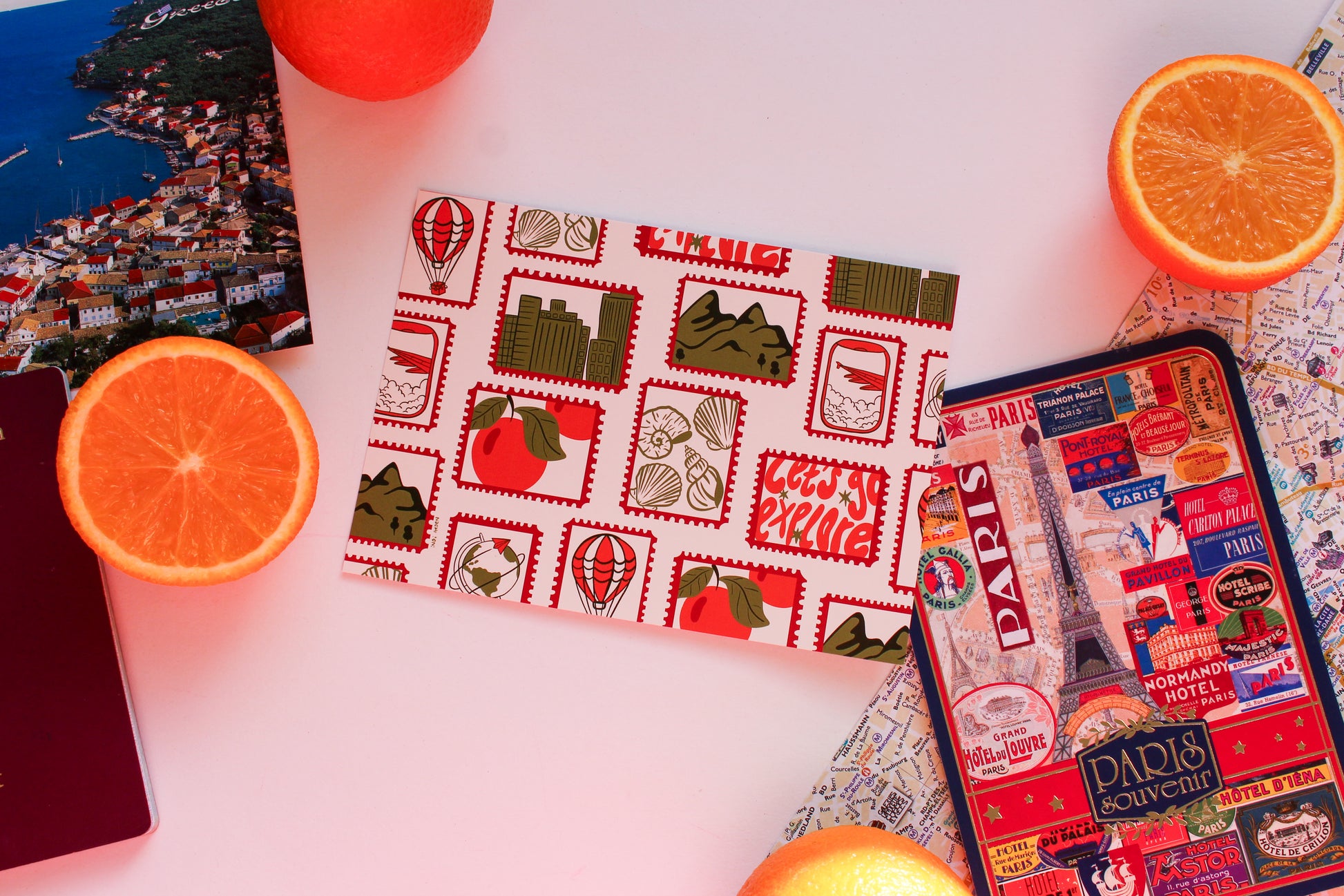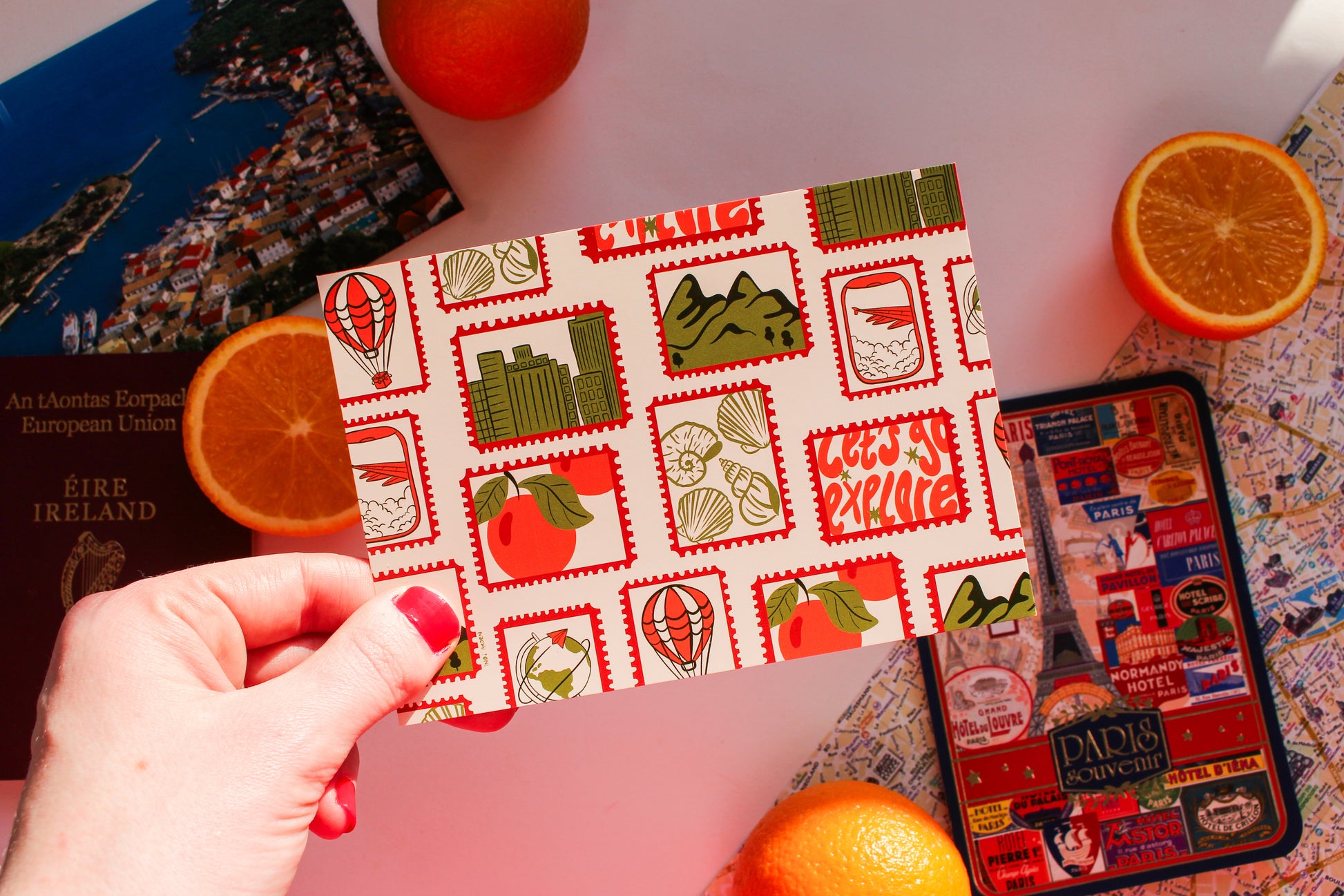 Send a little wanderlust through the post with these A6 travel-inspired postcards, featuring warm, nostalgic illustrations inspired by maps, travel stamps, and journaling on the go.